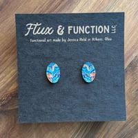 These earrings bring my favorite paint compositions to life in a new form. Each piece features a close-up photograph of wet paint details from my poured paintings, UV printed onto birch wood. Combining painting and photography, these wearable art pieces capture unique, abstract designs with a touch of natural texture.