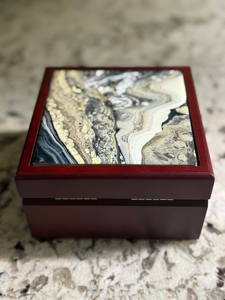 The 5"x5"x3" solid wood box is lined in ivory velvet, mahogany satin finish outside, spring-loaded, hidden hinge lid, felt feet on bottom to protect furniture.✨