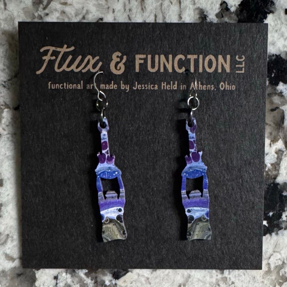 These earrings bring my favorite paint compositions to life in a new form. Each piece features a close-up photograph of wet paint details from my poured paintings, UV printed onto birch wood. Combining painting and photography, these wearable art pieces capture unique, abstract designs with a touch of natural texture.