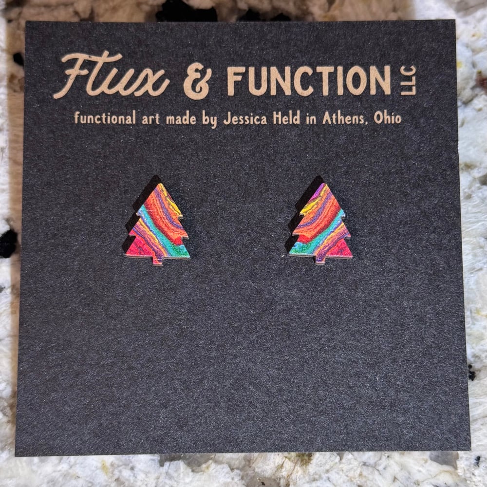 These earrings bring my favorite paint compositions to life in a new form. Each piece features a close-up photograph of wet paint details from my poured paintings, UV printed onto birch wood. Combining painting and photography, these wearable art pieces capture unique, abstract designs with a touch of natural texture.